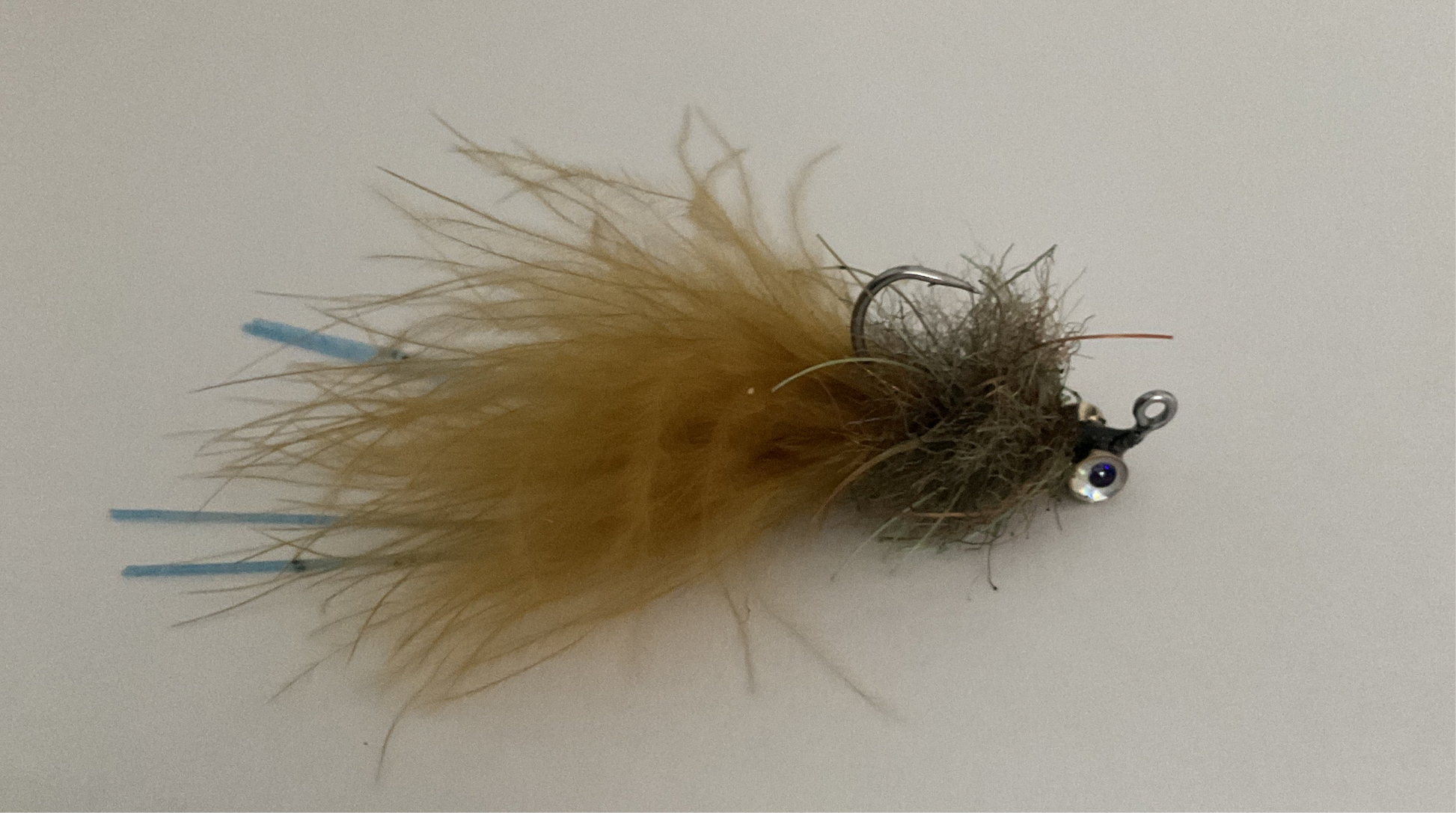 This is a hand tied, small batch redfish critter fly that is very successful. It’s is on a size #2 hook wrapped with marabou and tarantula legs and lead eyes.